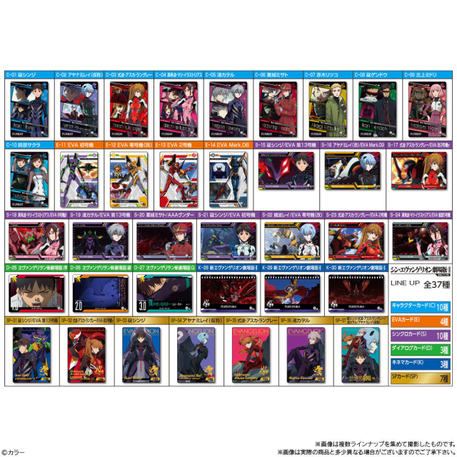 看到威化餅大家都知道又是一個收集收藏卡的商品了 XD,這次推出總共 37 張卡片供粉絲收集,以新劇場版的人物為出發,各種卡牌有不同等級,包含角色卡、EVA 卡、同步卡、名言卡、電影卡、SP 卡,如果要收集整套的朋友或許又要爆吃一波威化餅了XD。( 千萬不要像之前日本新聞報導一樣拿出卡就把餅扔了QQ )