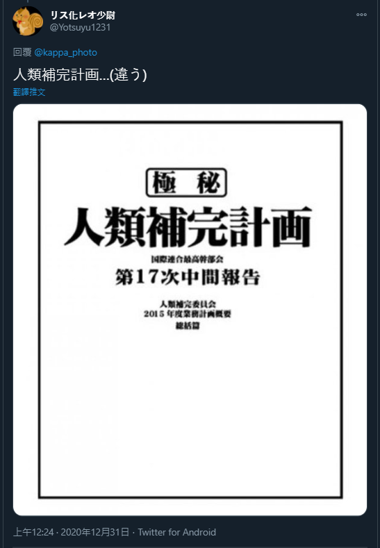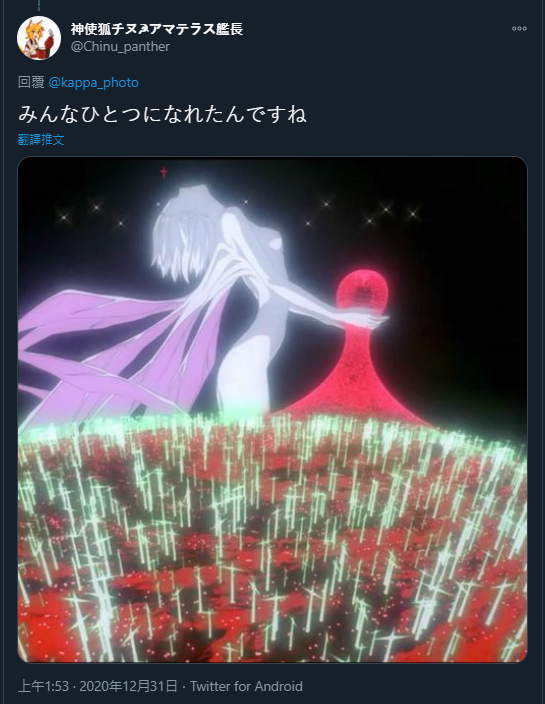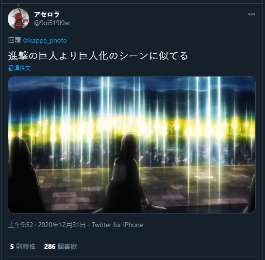 也因為這樣的奇景,在推主分享在推特上後,迅速得到不少網友們的熱烈討論,有人笑稱這是《進擊的巨人》巨人化的景象,也有人說看起來就讓聯想到《新世紀福音戰士》人類補完計畫,而且剛好12月31日這天就是「人類補完計畫」發動的日子(嚴格來說算週年了,動畫裡是發生在2015年12月31日)