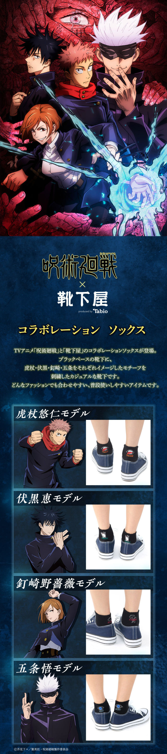 日本萬代旗下專門推出角色主題服飾、生活週邊的 BANDAI FASHION COLLECTION(バンコレ!)以人氣動漫作品《咒術迴戰》為主題設推出「東京都立咒術高等專門學校」制服外套後,這次再以劇中主要角色:虎杖悠仁、伏黑惠、釘崎野薔薇與老師五條悟為設計,和知名品牌「靴下屋 」合作推出「咒術迴戰×靴下屋 襪子」,每款售價為 1,760 日圓,預計將於 2021 年 4 月正式出貨。