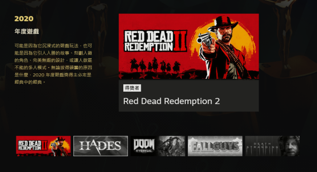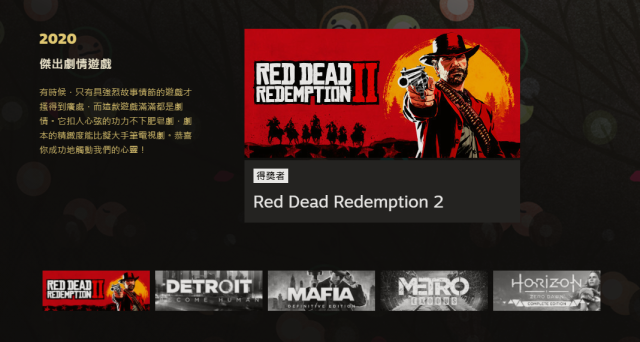 而其中最值得一提的是由Rockstar Games所開發的《碧血狂殺2》,一口氣拿下了「2020年度遊戲」與「2020傑出劇情遊戲」兩項重要大獎,儘管該作在發行不久後就得到相當兩極化的評價,但或許對於PC玩家來說,依然是值得備受肯定的一款遊戲。