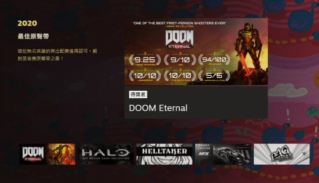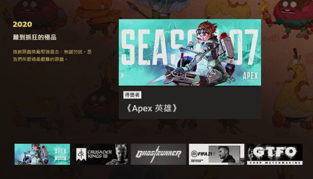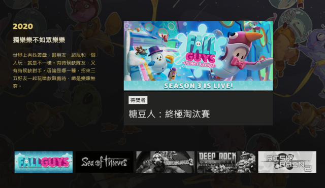 另外2020年討論度極高的《糖果人:終極淘汰賽》與不負眾望地,拿下「2020獨樂樂不如眾樂樂」獎項,回顧前幾個月,確實可以看到網路上不少玩家們熱切討論每一賽季的競技比賽,可愛的外表配上派對型大逃殺的模式,總能讓玩家們哭笑不得。