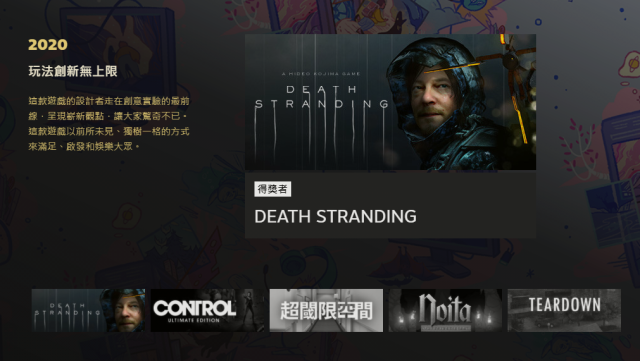 當然,由小島製作所開發的3A級大作《死亡擱淺》(Death Stranding)在2020年7月14日這天上架到Steam平台後,也立即受到全球PC玩家的熱烈關注,特別是在家機玩家的好評與熱譯之下,PC玩家們更是迫不及待在上市當天搶先開玩,因此該遊戲也被Steam玩家們列選「2020玩法創新無上限」獎項。
