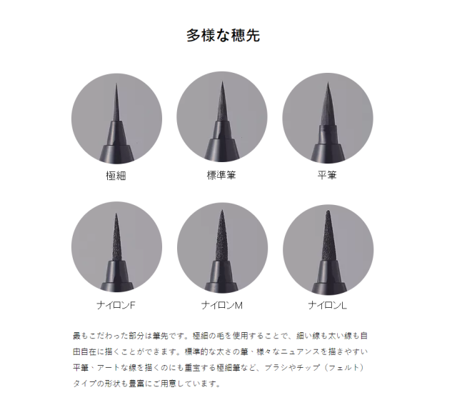 而日本吳竹不再只局限於文房四寶,如今它更拓展到全新領域!近日日本吳竹針對美妝市場,特別開發了各項種類的眼線筆,事實上這結合了他們毛筆「極細緻」的優點,開發出因應各種化妝需求的眼線筆,各種粗細及形狀是應有盡有。