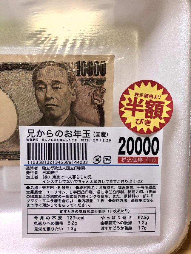而且更有趣的是,在保鮮膜外更是有著打折標籤貼紙,也就是說這本來是20000日幣的紅包,只是經過打折後就變成一張10000紙鈔了,這下子推主妹妹應該是要開心還是要哭呢?