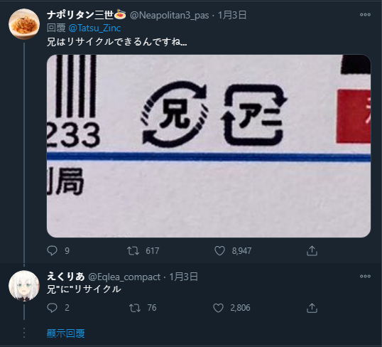 其實仔細一看,產品標籤也是做得相當用心,有眼尖的網友發現回收標籤被改成了「兄」、「アニ」字樣…欸等等!這是不是表示「哥哥其實是可以回收的呢?」,這不論怎麼看似乎也是挺惡趣味的啊XD