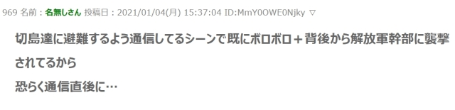 「在切島一群人在避難時,與她通話的那個模樣已經渾身是傷,再加上背後有解放軍幹部的襲擊,估計在通話結束後就......」
