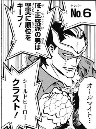 而這次逝去的另一位大家較為熟知,但又沒有到午夜時分如此熟識的角色就是英雄告示牌排行榜JP No.6 的「強盾英雄」庫拉斯特。外表為穿著披風的男子,被稱為守住THE·正統派男士的牢固位置。英雄個性為護盾,能夠隨時隨地從身體的表面製造出護盾。