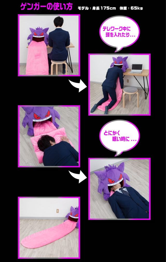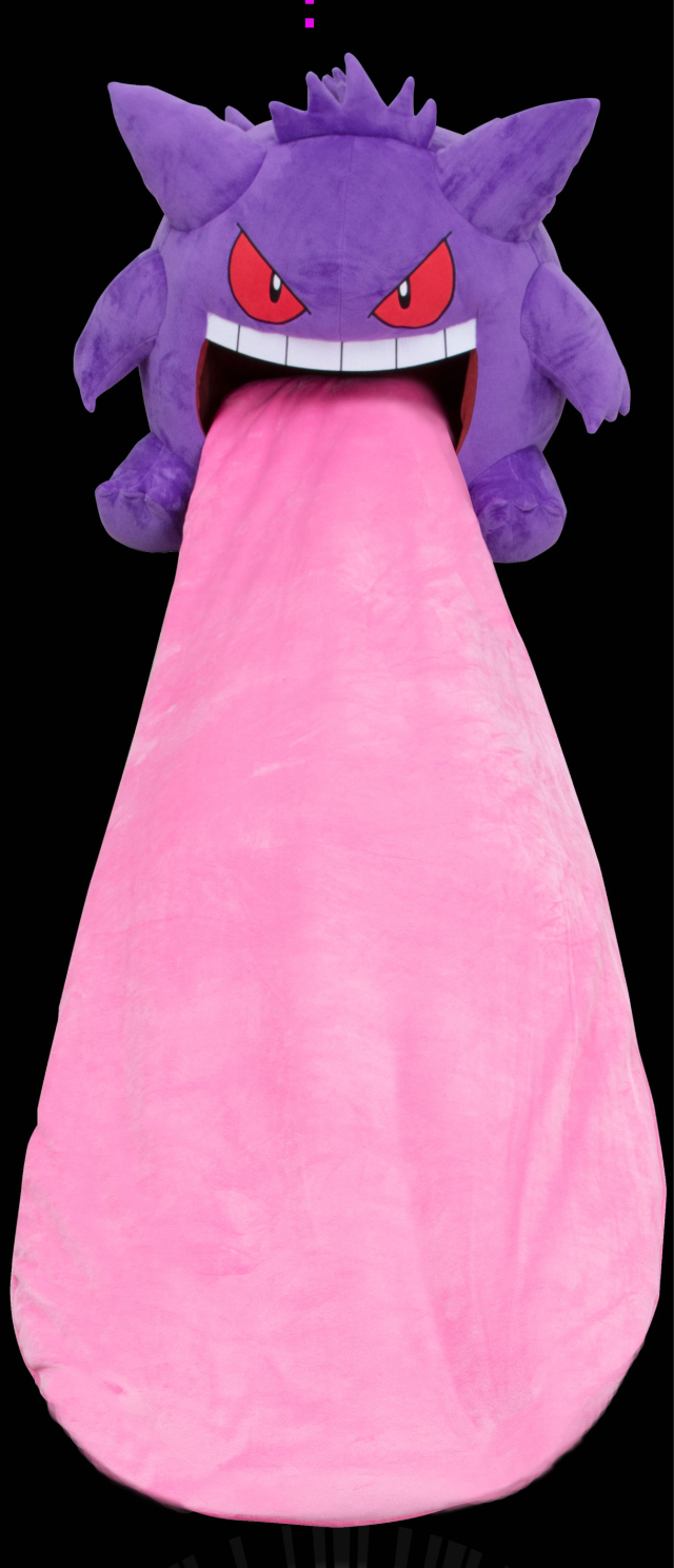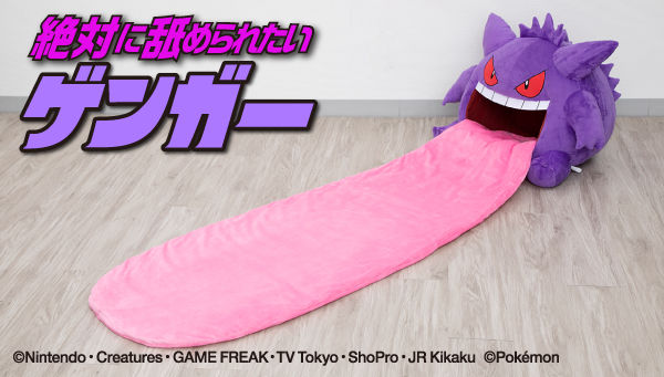 這次萬代推出的「絕對想被他舔的耿鬼」結合了耿鬼如黑洞般「能夠收納各式各樣東西的身體」和耿鬼具備招式之一的「 舌舔」 使對方陷入麻痺狀態等特性,將大舌頭化為長約 170 公分的毯子,讓你躺在耿鬼的舌頭上休息睡覺!