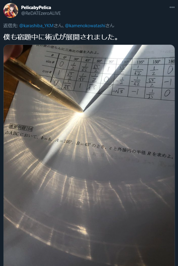 這篇推文造成不錯的迴響,也有人分享自己在寫作業時筆突然展開了「術式」,還有人想到這就和《鬼滅之刃》的猗窩座的術式一樣,總之,下次在陽光強烈的日子要丟瓶罐時先別急,把它放到陽光照得到的地方看看會不會出現更帥氣的魔法陣吧~