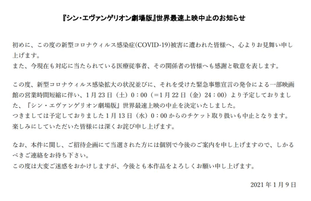 這一次,隨著新型冠狀病毒感染擴大的狀況,以及收到政府於近日宣布的『緊急事態宣言』通知,部分電影院的營業時間縮短,原定於1月23日(週六)0:00(=1月22日(週五)24:00)的《新·福音戰士劇場版》决定中止「世界最速上映活動」。而預定 1 月 13 日(週三)0:00開始販售的預售票也將停止預售。