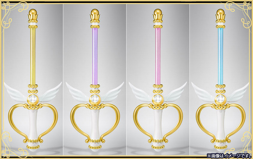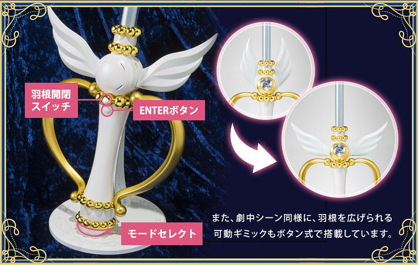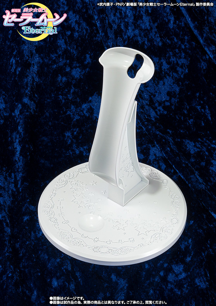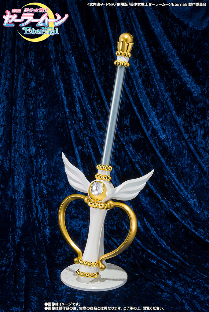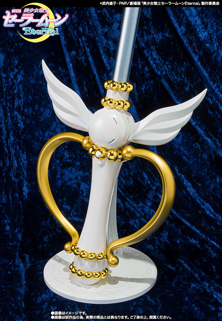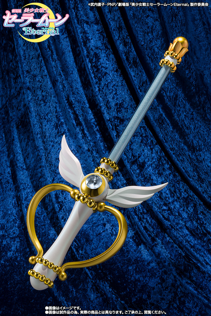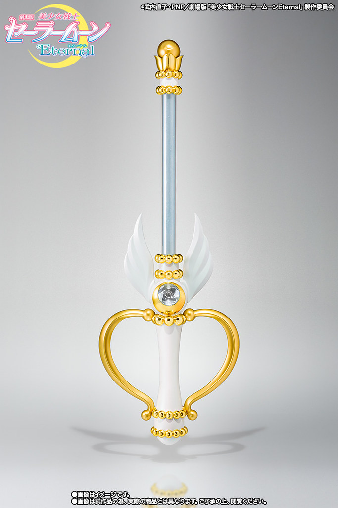 「PROPLICA 月光萬花筒神杖」,有別於 2016 年推出過的版本,這次以《劇場版美少女戰士Eternal》劇中白金配色的月光萬花筒神杖為設計,以約 530mm 的真實尺寸精緻還原!神杖的手柄施以質感的電鍍、金屬塗裝,在翅膀的部分也高度還原可摺收的可動設計~內置LED燈光閃耀出不同的彩虹光,打造夢幻光效,再現劇中的發光造型,並且有使用絕招時的配樂與三石琴乃聲優老師新錄製配音等音效,還有追加了小小兔聲優福圓美里錄製的「秘密模式」!另外附有星星雕花造型的專用展示架,整體超級夢幻~全方面滿足美戰迷!
