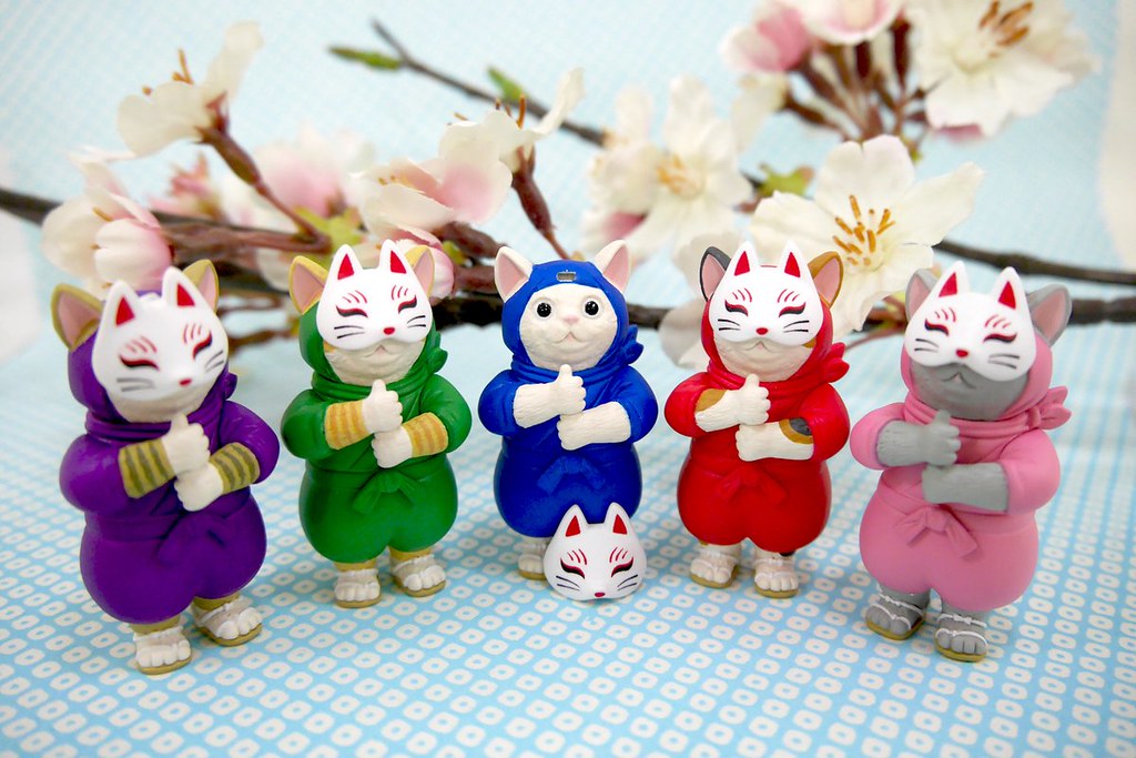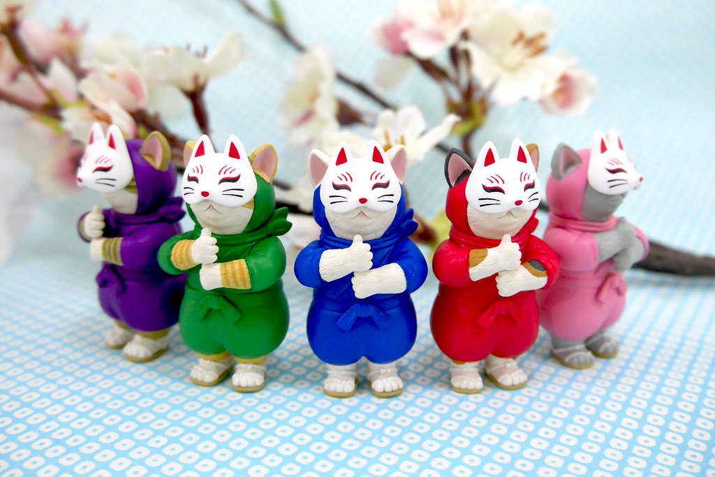 這次的「忍者貓咪 轉蛋」身穿超級鮮豔的五色忍者裝束,展現出忍者結印的擬人化造型,彷彿下一秒就會「咚嚨(ドロン)」消失一樣,頭套開了兩個洞可以露出尖尖的貓耳朵、加上線條圓潤的蓬蓬忍者服,整體真的非常可愛!一共有藍、紅、桃、紫、綠五款可以收集,最讚的是狐狸面具是採用獨立零件製作,一拿下來看到貓咪的圓滾滾大眼,直接被一個超可愛重擊!複數收藏還可以重現「喵分身之術」的場面喔!!期待~