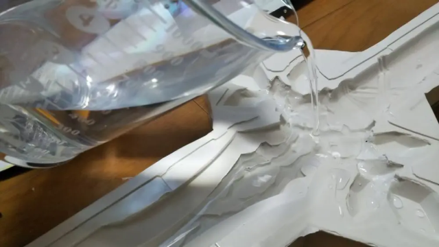 推主自行製作開模模具,倒入合適的透明樹脂製作,並且透過去除汽泡,調整輪廓等工法,製作出劍的初模。