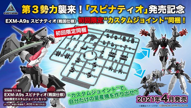 由日本 BANDAI SPIRITS 公司 HOBBY 事業部發行,具備快速組裝、便於改造特色,充分展現量產機魅力的原創組裝模型『30MINUTES MISSIONS』系列日前發表了最新商品「30MM 1/144 EXM-A9s 司比納帝歐 (戰國規格)」預計於 2021 年 04 月發售的消息。