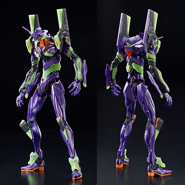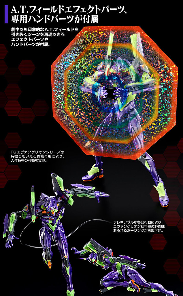「RG EVA 初號機」套件透過多種成形色零件、上色完成零件組成,單純組裝即可大幅再現劇中形象。延續 RG 系列特色設計出精密的骨架結構、多處裝甲(拘束器)的精密分割,關節能做出彷彿人體肌肉般的靈活動作,還設計出部份裝甲的連動機構,做出更加自然的動作,再現經典的蹲踞、起跑、暴走姿勢!
