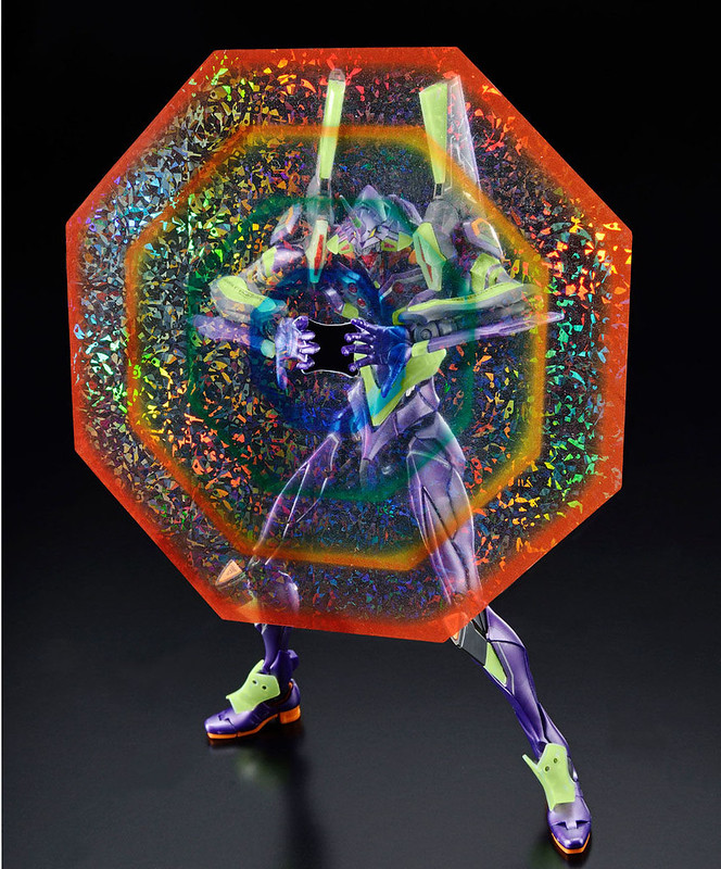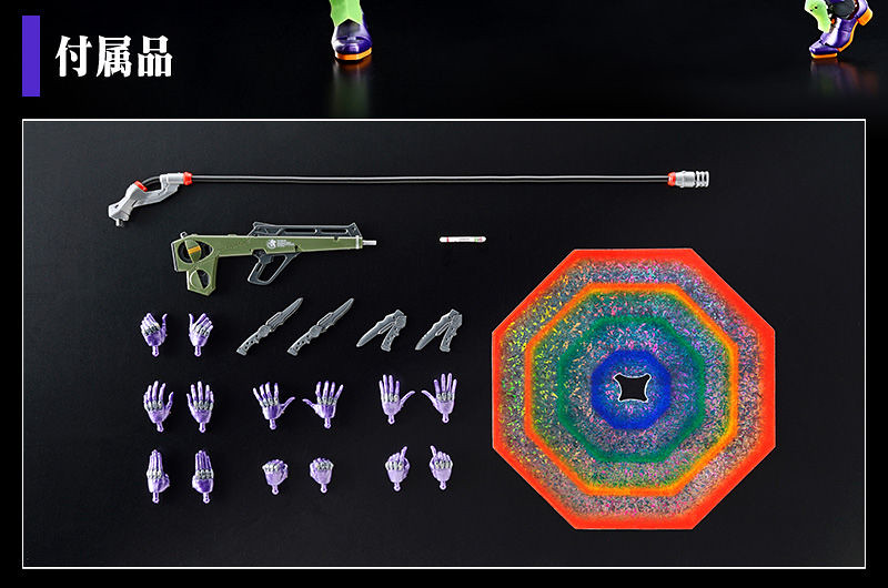 而武裝配件部份則包含:各種造型手掌、臍帶纜線、電磁步槍、插入栓、高振動粒子刀(展開)X2、高振動粒子刀(收納)X2、AT力場特效零件等,搭配高度可動的初號機本體把玩出豐富姿勢!