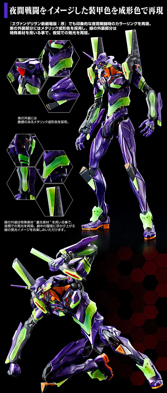 這次推出的夜間戰鬥規格則將裝甲(拘束器)零件的成形色替換,改為昏暗視線中深沉的金屬紫成形,綠色部份則使用蓄光材質製作,能在黑暗中產生螢光綠效果,再現《新劇場版:序》中令人印象深刻的夜戰場景。