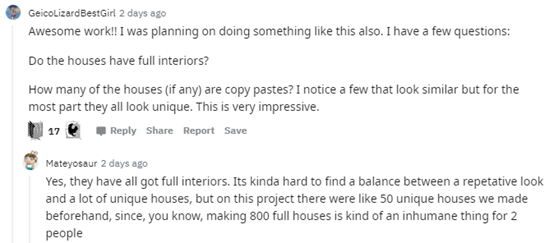 推主表示他們有完整的內部構造,但依照他們的人力只完成50種相異的房子款式,最後才隨機布局完整的800幢房子,畢竟「要弄800間不同的房子對兩個人來說有點太吃力了」,根據理解,他們在45天內便完成該作品,被網友讚嘆「羅馬不是一天造成的,是用一個月。」