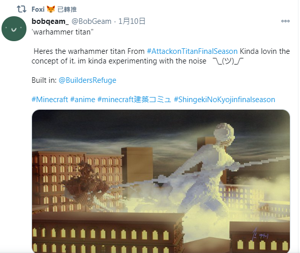 有粉絲詢問「有艾倫的地下室嗎」,推主風趣回答「請等待三季」,當然也有人關注等比例還原的藝術性,甚至許願可以「超大型巨人」,Foxi與網路的《我的世界》高手目前佔據reddit《巨人》板上高度話題性,也可以從推特看到許多同好的作品。