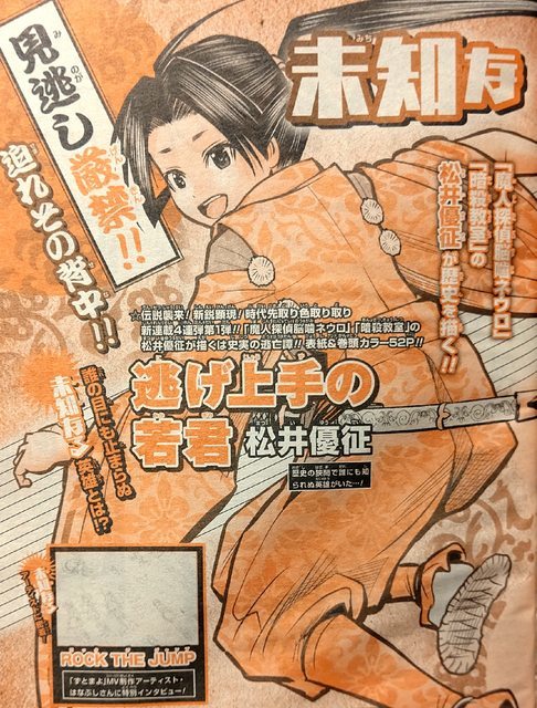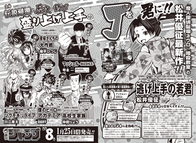 於今日 1 月 25 日發售的《週刊少年Jump》第 8 期上的預告頁上表示,接下來將會連續四期都加入新連載,而曾經連載過《魔人偵探腦嚙涅羅》、《暗殺教室》的松井優征,以及曾連載過《SKET DANCE》、《彼方的阿斯特拉》的篠原健太,都將在這次的四彈新連載中回歸JUMP本誌。