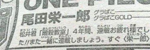 在 2016 年《暗殺教室》完結時,《航海王》作者尾田榮一郎甚至還在《週刊少年Jump》尾頁作者的話上面表示:「松井君《暗殺教室》連載四年間辛苦了!! 之後再繼續一起連載吧。立刻馬上」。可以看得出來尾田是十分迫切松井回歸的,所以這次松井老師回歸JUMP本誌連載或許最開心的不是讀者們,而是尾田榮一郎吧XD