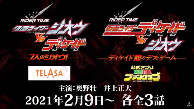 東映最近解禁了《假面騎士Decade》與《假面騎士ZI-O》的最新連動特別篇《RIDER TIME 假面騎士ZI-O VS Decade/7人的ZI-O!》(仮面ライダージオウ VS ディケイド/7人のジオウ!)與《RIDER TIME 假面騎士Decade VS ZI-O/Decade館的死亡遊戲》(仮面ライダーディケイド VS ジオウ/ディケイド館のデス・ゲーム)這兩部的相關情報,監督由諸田敏擔任,腳本由特攝作品常客的井上敏樹製作。