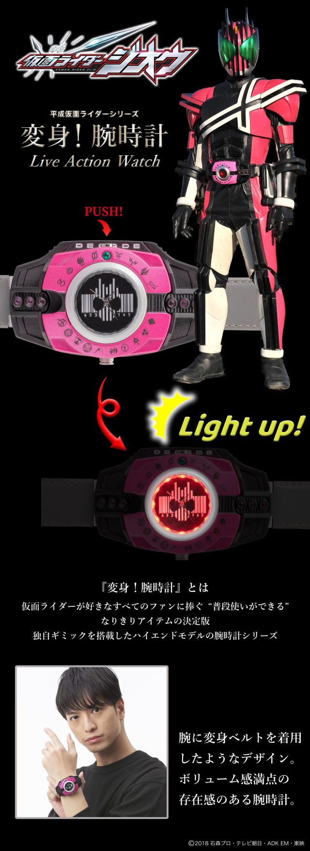 「變身!腕時計 Live Action Watch」系列是以「平成假面騎士」的變身腰帶為主題,將錶身設計成騎士腰帶的造型,這次是推出「ZI-O」版的「假面騎士Decade」所使用的變身腰帶「Neo Decadriver」,錶身按照驅動器本身的品紅色外表和周圍環繞的20位平成假面騎士標誌,內部也跟驅動器一樣,在按下按鈕時會跟驅動器本體一樣發光,讓人彷彿戴上就如同成為門矢士一樣,能夠主宰任何的世界。