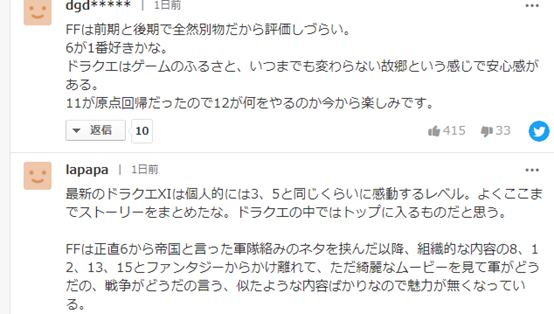 對於此結果,綜觀發言,有些玩家表示「喜歡DQ歡愉的樂趣性,有別於FF的沉重電影氛圍」、「喜歡鳥山明老師的風格」、「DQ的怪物比較可愛!」另外,也有人表示「FF在去年上下半部的決勝關鍵有很懸殊的風評」,也有老粉絲提出每一代版本巨大的落差造成的不公平性。