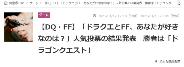 DQ《勇者鬥惡龍》(Dragon Quest)& FF《最終幻想》(FINAL FANTASY)一直以來都是日本最具代表性的RPG遊戲,目前兩者都由Square Enix公司處理,而本次由Netorabo民調團隊處理「2020年12月12日到2021年1月11日」中最喜歡的RPG遊戲票選,繼2014年來之後最正式的的結果出爐。
