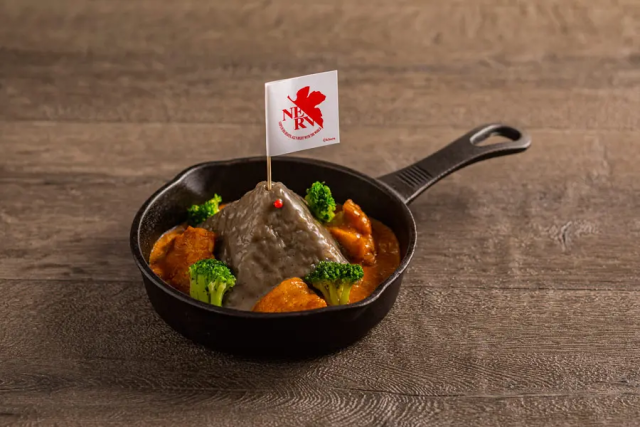 以 NERV 總部的外型設計飯的樣貌,配上周圍的外觀,淋上起司醬的咖哩雞飯。