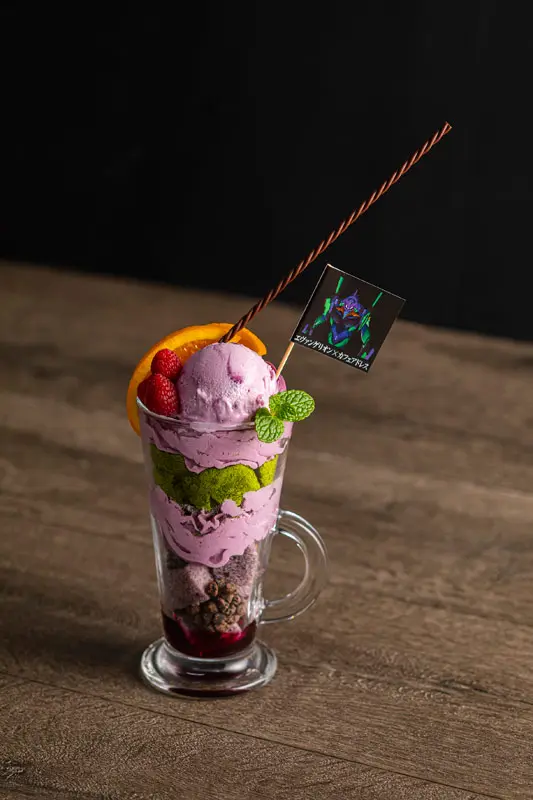 以芋頭與抹茶口味的冰淇淋堆疊,呈現出初號機配色的形象。下面有著藍莓口味的蛋糕與果醬,搭配巧克力呈現出的百匯風味。