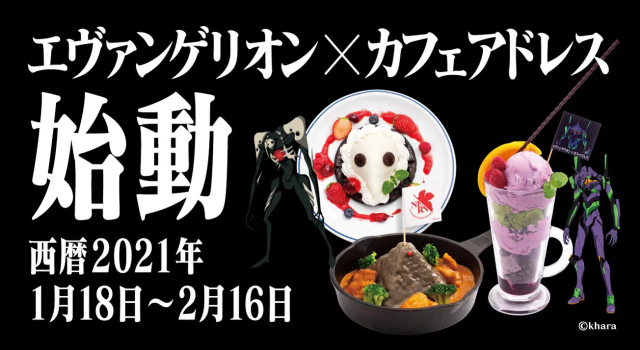 雖說《新·福音戰士劇場版:│▌》最近宣布原本日本 1 月 23 號上映取消,目前未知確切上映日期,讓許多福音戰士粉絲頗為失望,但是聯名活動並沒有停止 XD。將與日本的池袋 PARCO 6 樓的咖啡廳 Cafe Address (カフェ・アドレス)合作,開設期間限定的聯名餐廳。將推出許多擁有 EVA 風格的聯名餐點。活動期間將於 2021 年 1 月 18 日~2021 年 2 月 16 日舉辦,約莫一個月的期間等著福音戰士粉絲前來。