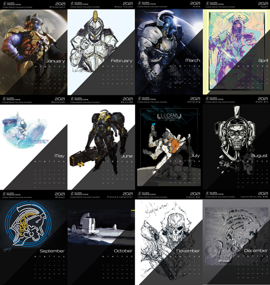 新川洋司作為日本插畫總監,以《潛龍諜影》的設計稿所著名,在2015年隨小島秀夫離開《knnami》公司後加入其工作室,他的強項以「機械結構」設計使粉絲著迷。近期的他們向全世界徵稿,舉辦「#LudensDesignChallenge#」活動,決定挑選12幅作品作為2021年的電子月曆,充滿著各式各樣的科幻風格。