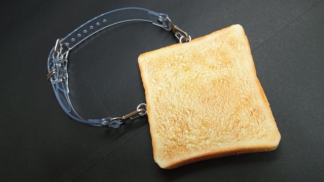 好,那問題來了!如果要忠實呈現出咬著白吐司奔出家門的場面,除了真的買一條吐司自己咬出家門外,還可以怎麼做?我是指…真的吐司咬久了肯定是會掉下去的啊!於是日本推主鞭匠 初代 桃太郎(@momowhips)在日前就分享由他自己所發明的「いっけなーい、遅刻遅刻!口枷」,也就是說將吐司用帶子串起來,並且戴在臉上。