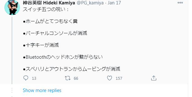 愛之深責之切,神谷英樹打開了自己的任天堂頁面,發現上面充斥著遊戲,雖然上面滿口惡毒發言,但是因為本身作為一個「熱愛遊戲的玩家」來說,語重心長的發言與糾正都是正面擊球,自己也還不時會分享任天堂資訊,甚至有些網友戲稱「神谷英樹根本是想當任天堂的公司顧問吧!」