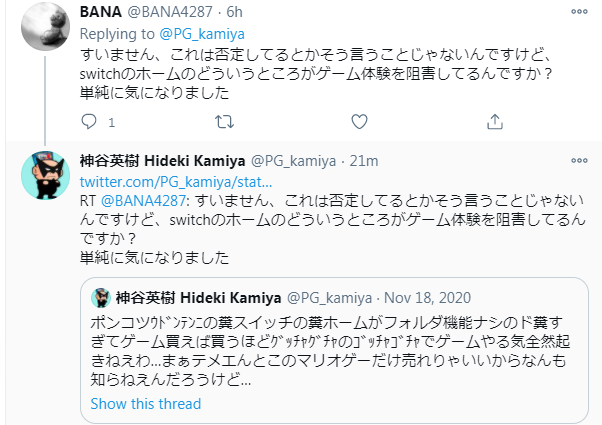 在討論中,神谷表示了任天堂是一群只知道「怎麼賣瑪莉歐的XX」,尤其對主畫面的分類功能極其不滿,這破壞了玩家體驗,使他們沒有繼續的動力,而對於服務和功能的延續、手把硬體多麼糟,以及預言「淘汰」的嚴重性無比犀利,使人難以反駁,和網友的討論也更是口無遮攔。