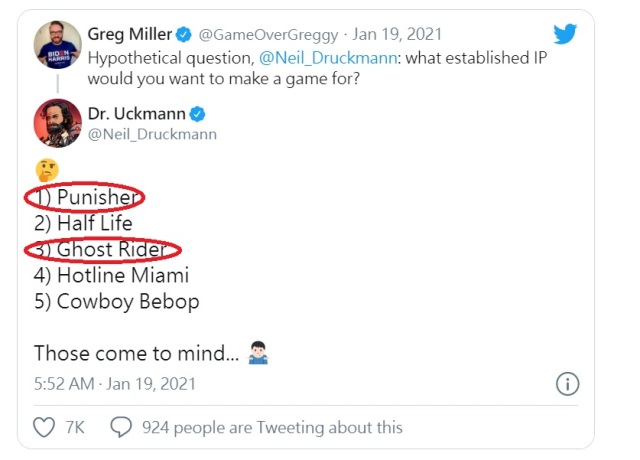 是滴你沒看錯!據本人在推特接受 Greg Miller 提問時表示,他強烈希望能為漫威知名的反英雄《制裁者 The Punisher 》與《惡靈戰警 Ghost Rider 》「量身打造」電玩遊戲,詳見推特連結,而被點名的對象也包含了在美國大受好評的日本動畫《星際牛仔 Cowboy Bebop》!