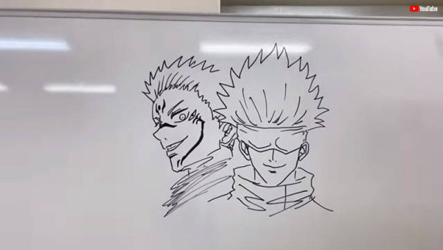田島直彌是搞笑藝人組合「アイデンティティ」的其中一人,他最著名的就是模仿聲演《七龍珠》孫悟空的老牌聲優野澤雅子,不只聲音很像,就連樣貌也要打扮成她,而他這次將挑戰用兩分鐘時間畫出五條悟和兩面宿儺,在影片中他依然保持著野澤雅子的裝扮並和他的夥伴見浦彰彥邊聊天邊素描,最後兩位角色畫完時間是2分36秒,雖然不是兩分以內,但是這種成績已經很厲害了,雖然野澤(田島)小姐不是很高興XD