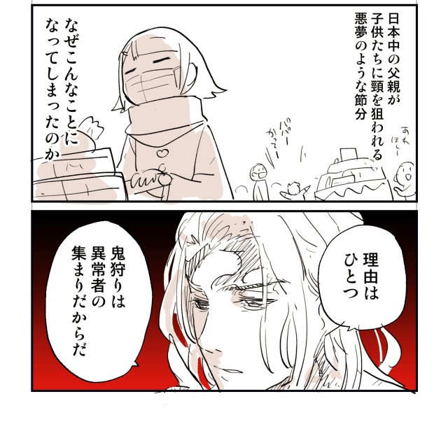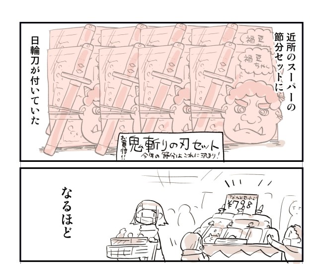 近日日本繪師ぬこー様ちゃん(@nukosama)在推特上分享了一則畫作,簡單來說就是今年日本節分祭是在2月2日這天,那包含推主也開始準備節慶這天所需的東西,其中也買了鬼面具啊、玩具刀這類的,畢竟現在《鬼滅之刃》還是火熱的,商品免不了都會跟上流行。