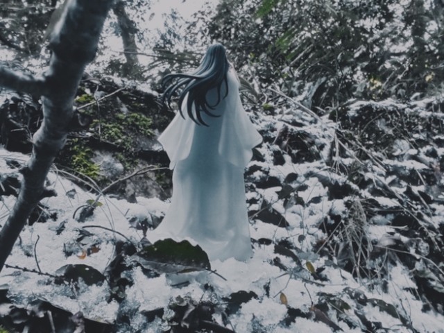 服裝上最讓我喜歡是這件飄逸白色透明感的羽織,放在有雪斜坡上,背影的呈現更增添不少神秘感,如日本民間傳說在雪中穿著白色和服的美貌女子