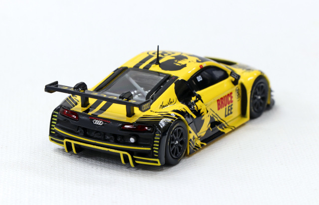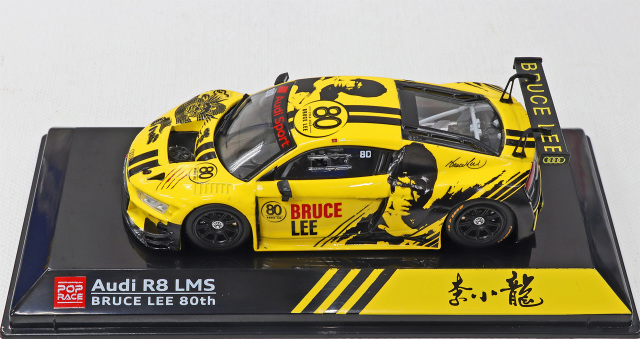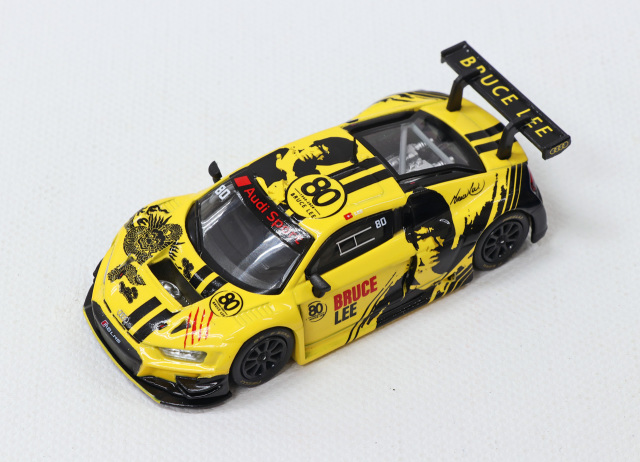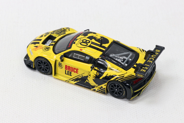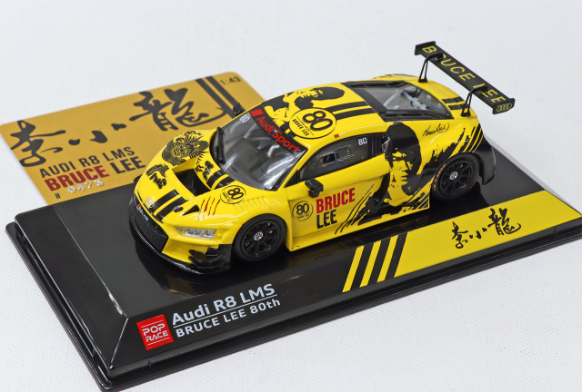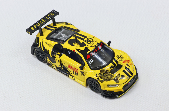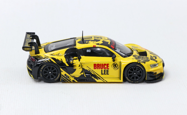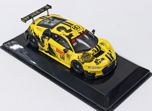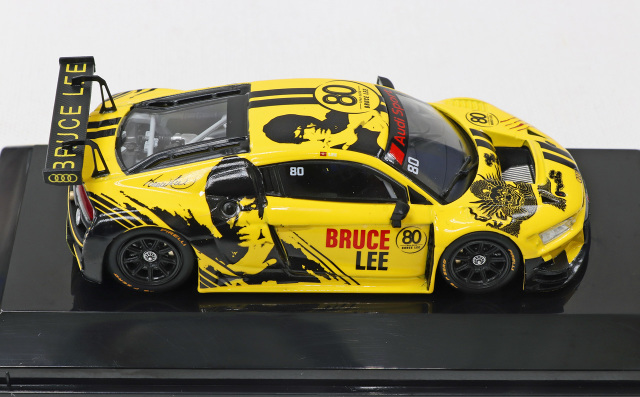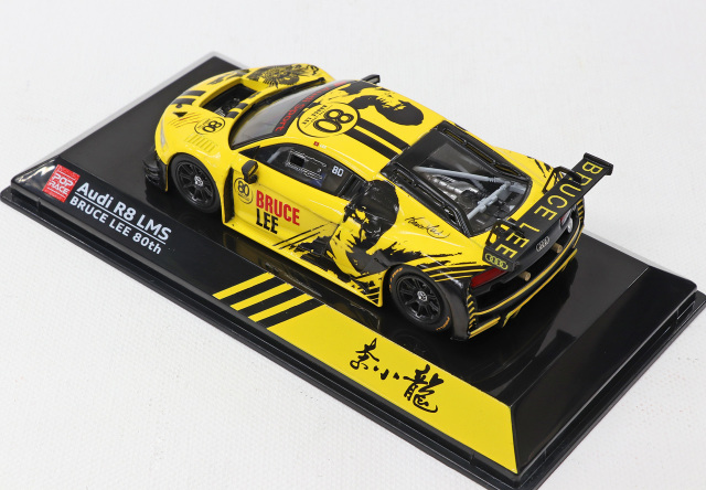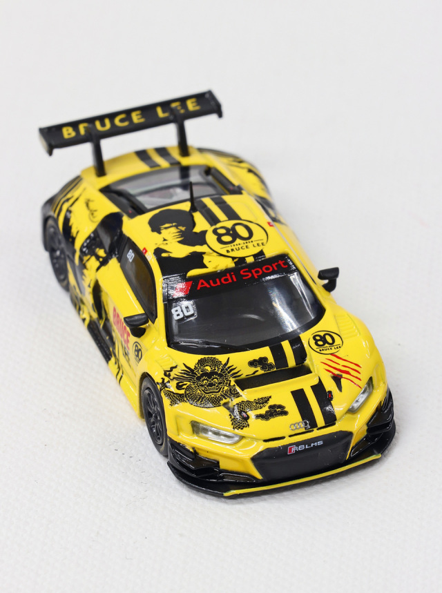 車身拉花於是以李小龍專屬黃色為主,並印有編號「80」,車身、車頂印有李小龍先生武打模樣,細看會見到李小龍先生的簽名和其標誌性的四道爪痕,高尾翼上更會見到「Bruce Lee」的字樣。1/43 Audi R8 LMS 更配有特別底座及附送限量卡一張。