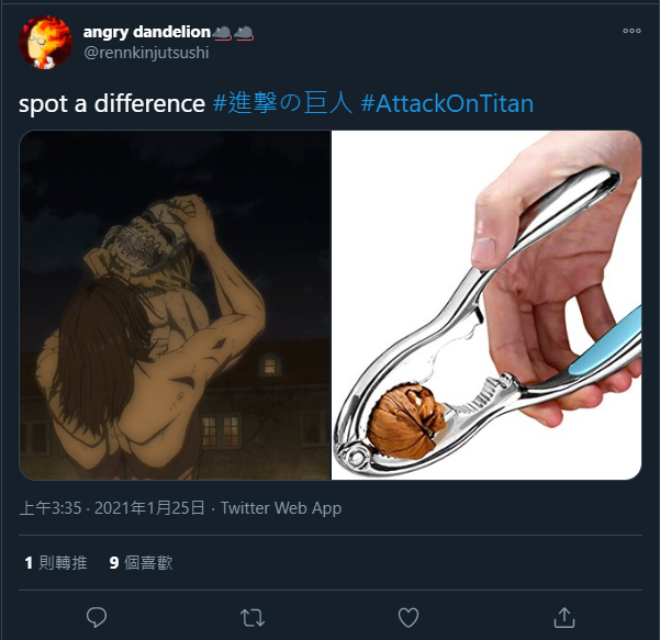 ▼彈幕上滿滿的「胡桃鉗」、「開罐器」梗,來暗指艾連利用顎之巨人的力量來壓碎硬質化的戰錘巨人