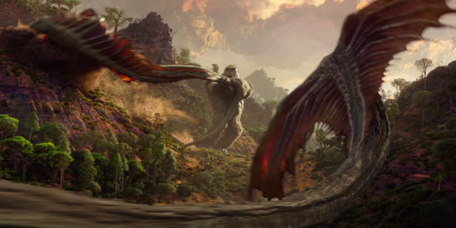 除了蛇型的戰蝠外,2:07 金剛站在發著藍光哥吉拉圖騰上的那段,出現了一群像是蝙蝠的怪獸,這些應該是名為「驚魂禿鷹」(Psychovulture)的生物。當初《金剛:骷髏島》上映時就有披露牠們的資料,但並未實際登場於電影中,在作為該片前傳兼後傳的漫畫《骷髏島:金剛的誕生》(Skull Island: The Birth of Kong,2017)中才有所發揮,如今我們終於能在大銀幕上見到牠們的表現。