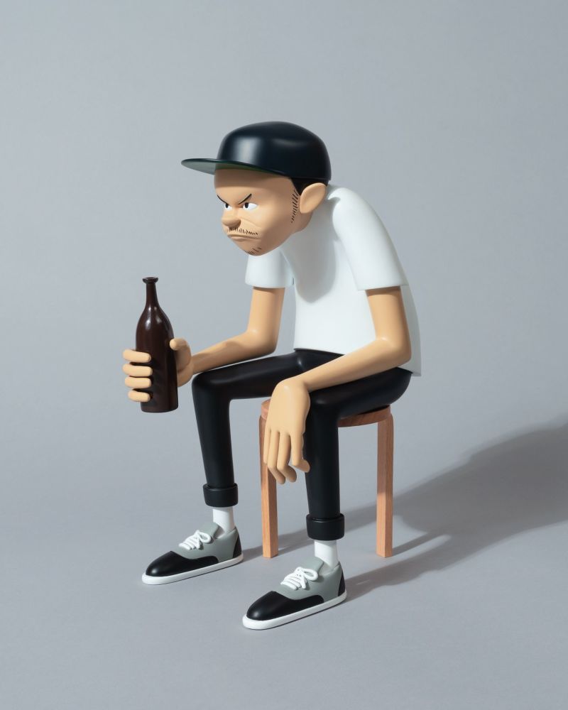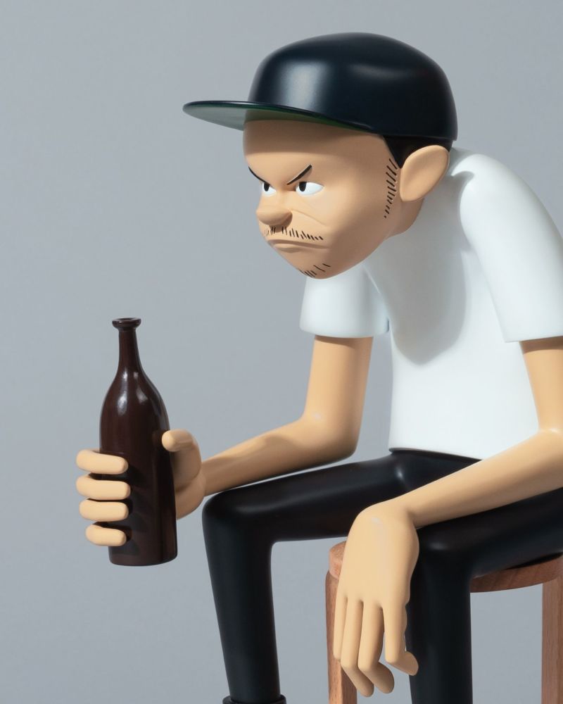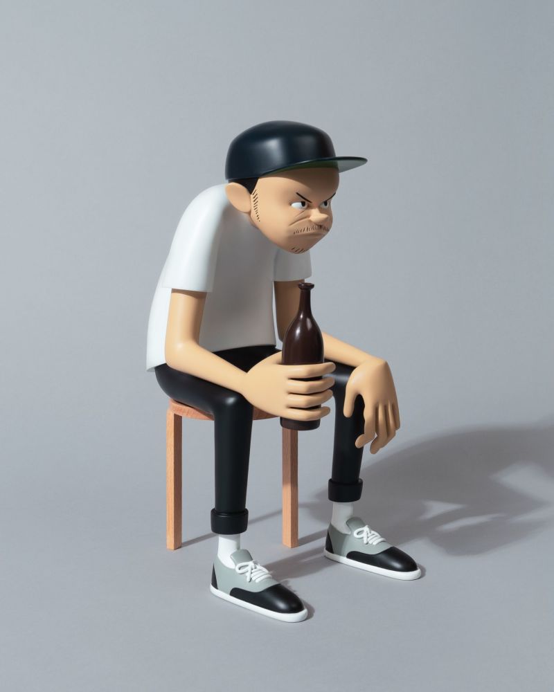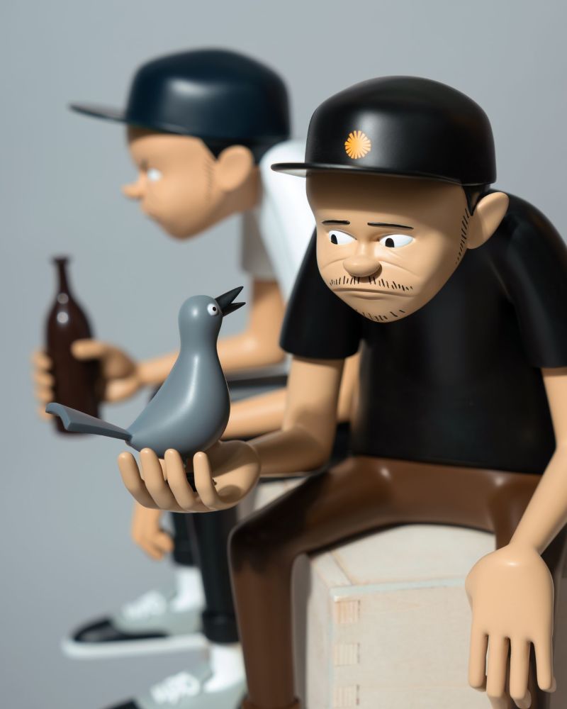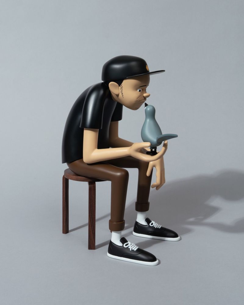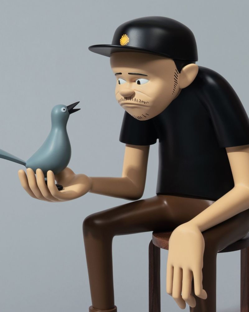 以「失敗、被嫌棄、失去摯愛、全球疫情等…每一個人都必然要經歷人生辛酸,但人生總要繼續下去。只要稍作休息定必可再發奮向前走。」為創作《DOWN BUT NOT OUT》動機的花井,這次除了推出 11 吋版本的DOWN BUT NOT OUT作品,另外也帶來了一樣象徵著潦而不倒、絕處逢生的「WE WILL FLY AGAIN」作品。一臉苦悶的中年漢看著掌中的灰色小鳥,等待著再次起飛的機會。