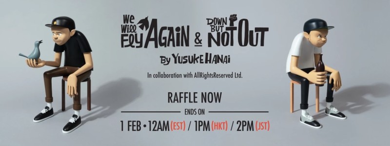 日本著名藝術家花井祐介與 AllRightsReserved 在先前合作的《MEET Yusuke Hanai PROJECT》全新概念創作項目中,帶來限量原木雕塑《DOWN BUT NOT OUT》,這次雙方再度攜手,推出兩款 11 吋限量作品「DOWN BUT NOT OUT」及 「WE WILL FLY AGAIN」!將在 DDT Store 網路商店全球首發,於 2021 年繼續展現面對時艱豁然態度~
