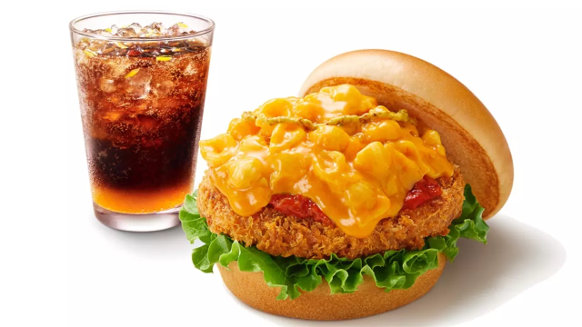 起司通心麵(Mac and Cheese/マッケンチーズ )事實上是歐美的家常料理,將通心麵與奶酪醬交織在一起,並以焗烤風格完成。根據摩斯漢堡自己的調查,大約 88% 的日本人其實並不知道這種食物。這次將其放上摩斯自豪的可樂餅漢堡,搭配芥末醬與特製肉醬,展現出絕妙的搭配口感,相信是提供給各位摩斯粉絲冬季最適合的餐點之一。