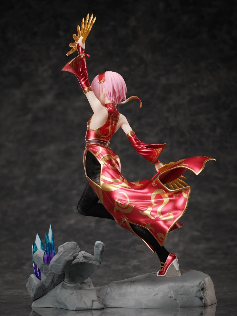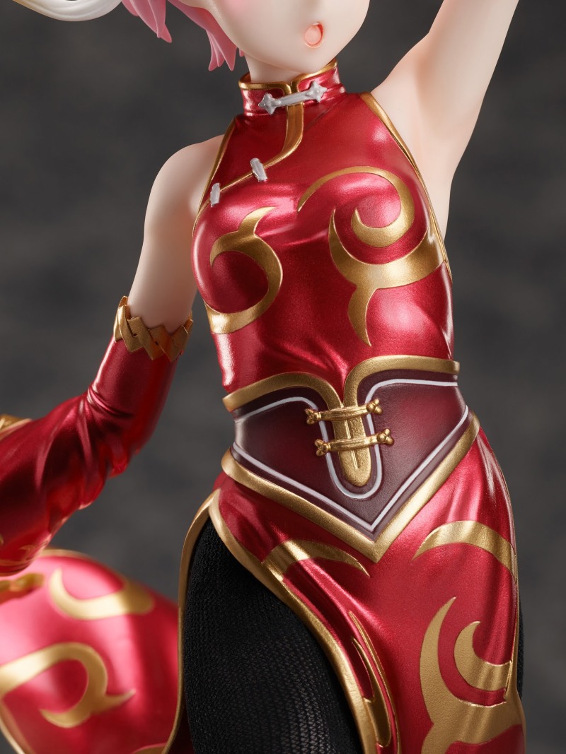 「拉姆 中國旗袍ver.」1/7 比例塗裝完成品,尺寸全高約25.5公分,將拉姆塑造成身穿中國旗袍風格!以揮舞鐵扇武器的輕盈姿態呈現。一身華麗又充滿喜氣的滾金邊金屬紅色旗袍,仔細刻畫了衣服的皺褶和紋理,露出雪白美背與腋下~在飄逸裙擺下的腿部則是布製網襪包覆,呈現自然的透膚感。臉上泛紅的粉嫩雙頰與生動表情相當可愛動人~岩石造型的地台可與雷姆互相連結,擺飾出姊妹一同戰鬥的場景!
