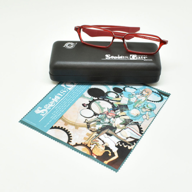 另外,眼鏡盒和眼鏡布套組也同時發售。眼鏡盒的兩面除了印有未來道具研究所的LOGO外,還印有作品LOGO和研究所全名。眼鏡布則是使用了原作遊戲的原畫插圖,有【A】、【B】兩個種類可挑選,如果搭配「牧瀬紅莉栖 耳機眼鏡」購買會達到絕佳的相乘效果。