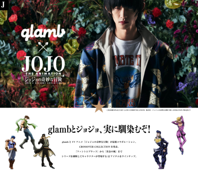 glamb 身為街頭潮流品牌,以頹廢搖滾風格又帶有華麗氣息的風格深受粉絲喜愛, 在2003年由設計師古谷完創立。在日系街頭服飾品牌,算是相當獨樹一幟的存在。這次與《JoJo的奇妙冒險》的聯名,事實上先前與不少動漫作品合作過,且也不是第一次合作了。這次將融合 glamb 獨有的風格與《JoJo的奇妙冒險》世界觀,打造具有特色的服飾商品。