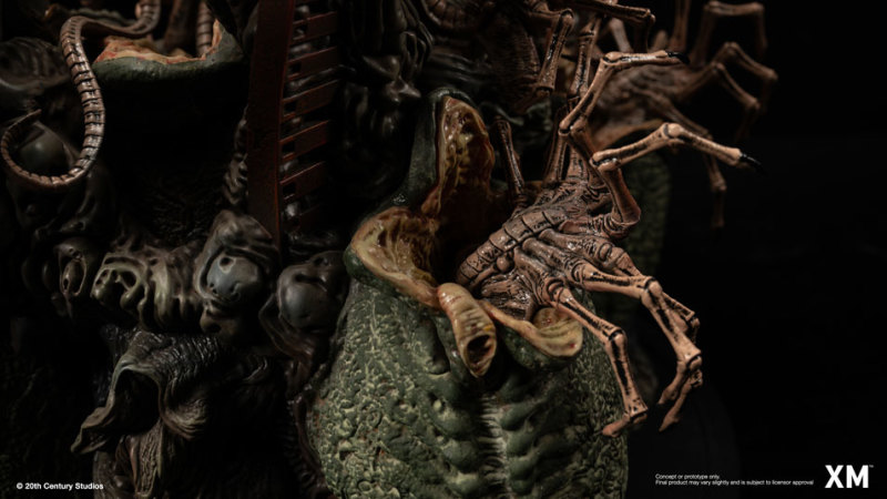 本作高度來到 78 公分,不僅表現出異形的設計魅力與黑暗的優雅美感,還注入了異形生命週期的概念在裡頭,成體的巢穴異形戰士正在佈滿同類的環境裡行動,四周是異形蛋以及破蛋而出的抱臉體(Facehugger),在在讓人感受到 Xenomorph 這個物種的強烈危險性;再來看到造型部分,巢穴異形戰士有著細長的四肢與尖銳、有力的尾巴,精美的漸層色讓這隻異形展現出逼真的生物感,吐出狀態的內巢牙(口內嘴)與雙手的利爪則帶來極強威脅性!